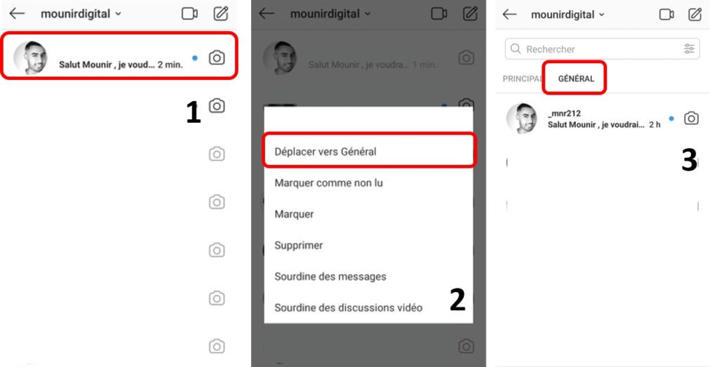 Dans la boîte de messagerie Instagram Direct, il y a deux sous rubriques de messagerie. La boîte “ Principal “ et la boîte “ Général “. Au début, je me suis dis mais “ Pourquoi Instagram a décidé de séparer la messagerie en deux sous-messageries ? “ Voici donc comment je procède avec mon compte Mounir Digital :